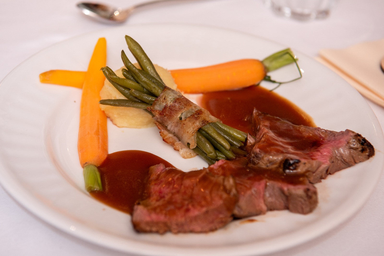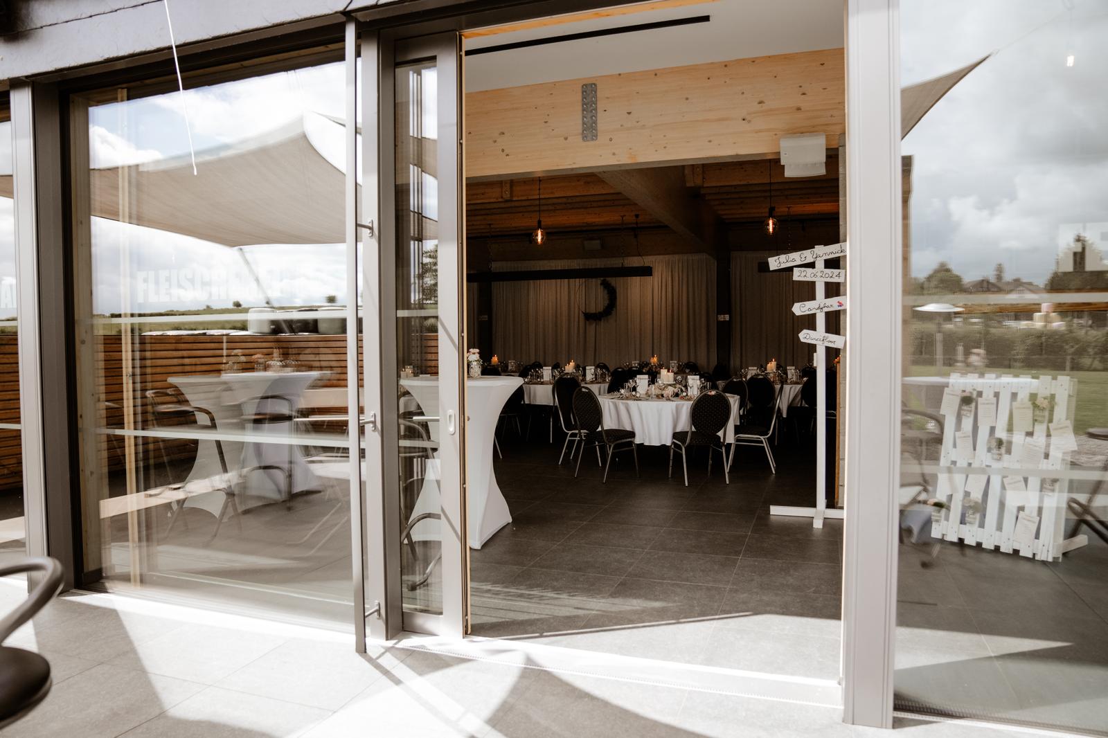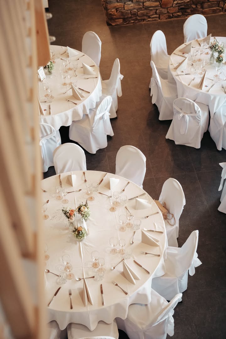 Der helle Festsaal ist mit großen Fenstern ausgestattet und bietet Platz für bis zu 150 Gäste. Daran angeschlossen befindet sich eine großzügige Terrasse, die sich wunderbar für den Aperitif im Freien eignet. Die direkt angrenzende Rasenfläche verstärkt diesen ländlichen Flair zusätzlich.